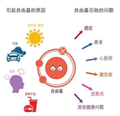 外界环境中的阳光辐射、空气污染、吸烟、农药等都会使人体产生更多活性氧自由基,使核酸突变,这是人类衰老和患病的根源。过多的活性氧自由基就会有破坏作用,导致人体正常细胞和组织的损坏,从而引起多种疾病。如心脏病、老年痴呆症、帕金森病和肿瘤。